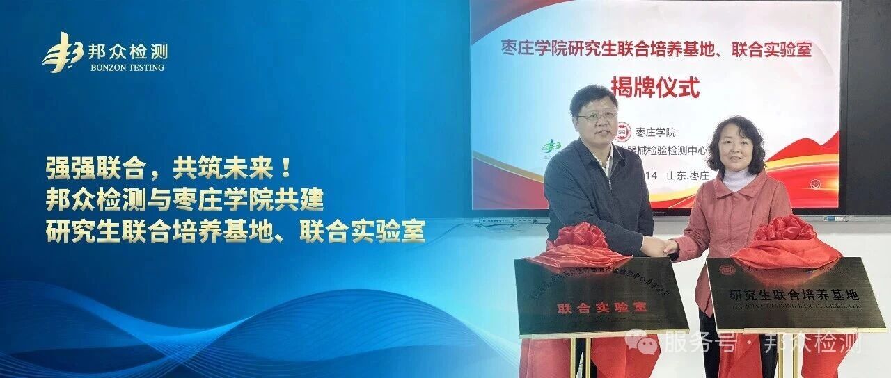 仪式上,枣庄学院副校长李目海与山东邦众检测总经理李淑翠共同为“联合实验室”与“研究生联合培养基地”揭牌。食品科学与制药工程学院院长王京龙与山东邦众检测总经理李淑翠代表双方签署联合共建协议,确立了长期稳定的战略合作关系。